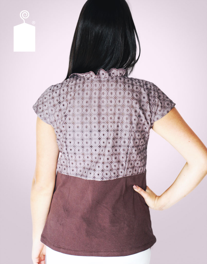 Blusa manga corta con cuello y pieza cubre botones en librete. Talle princesa con base en punto
