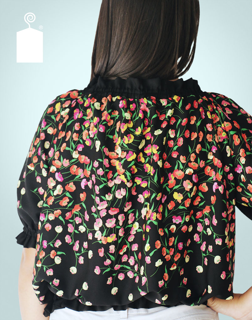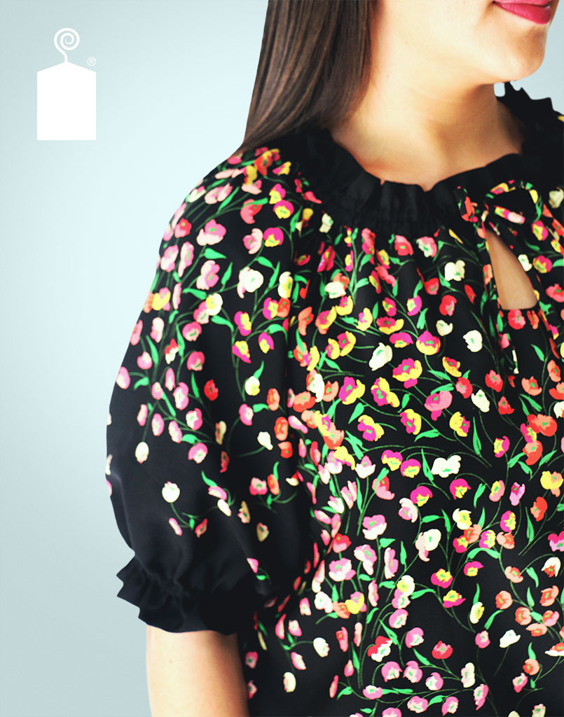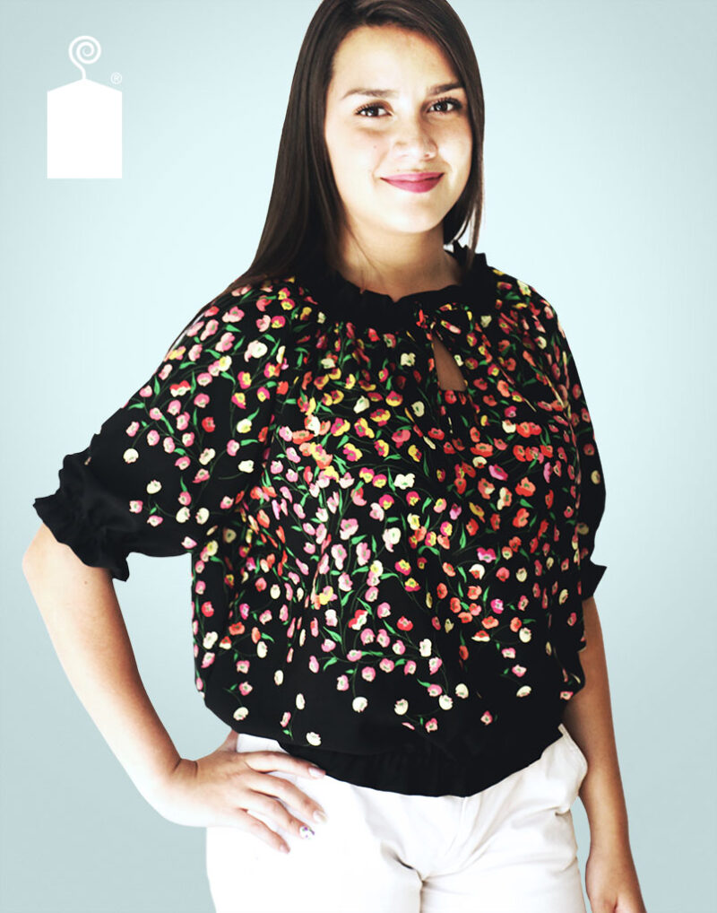 Blusa con cuello y mangas 3/4 en elástico. Lazo y apertura al frente