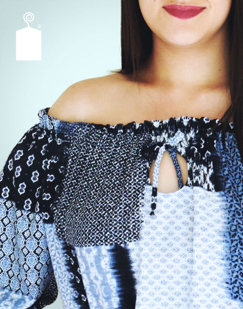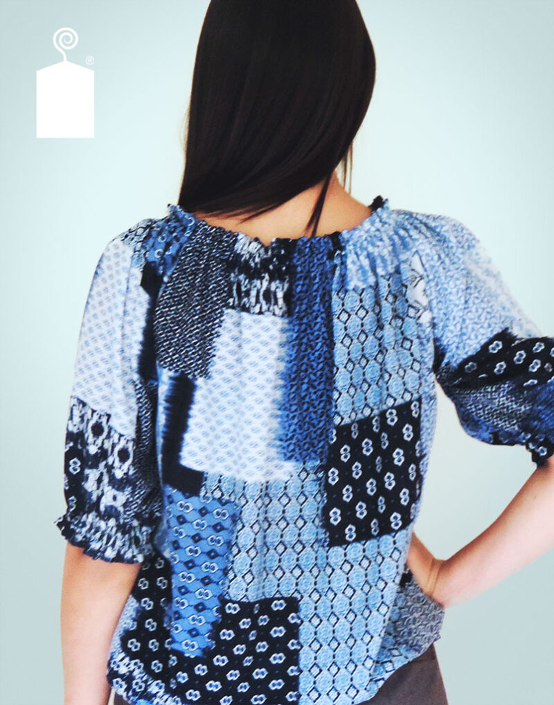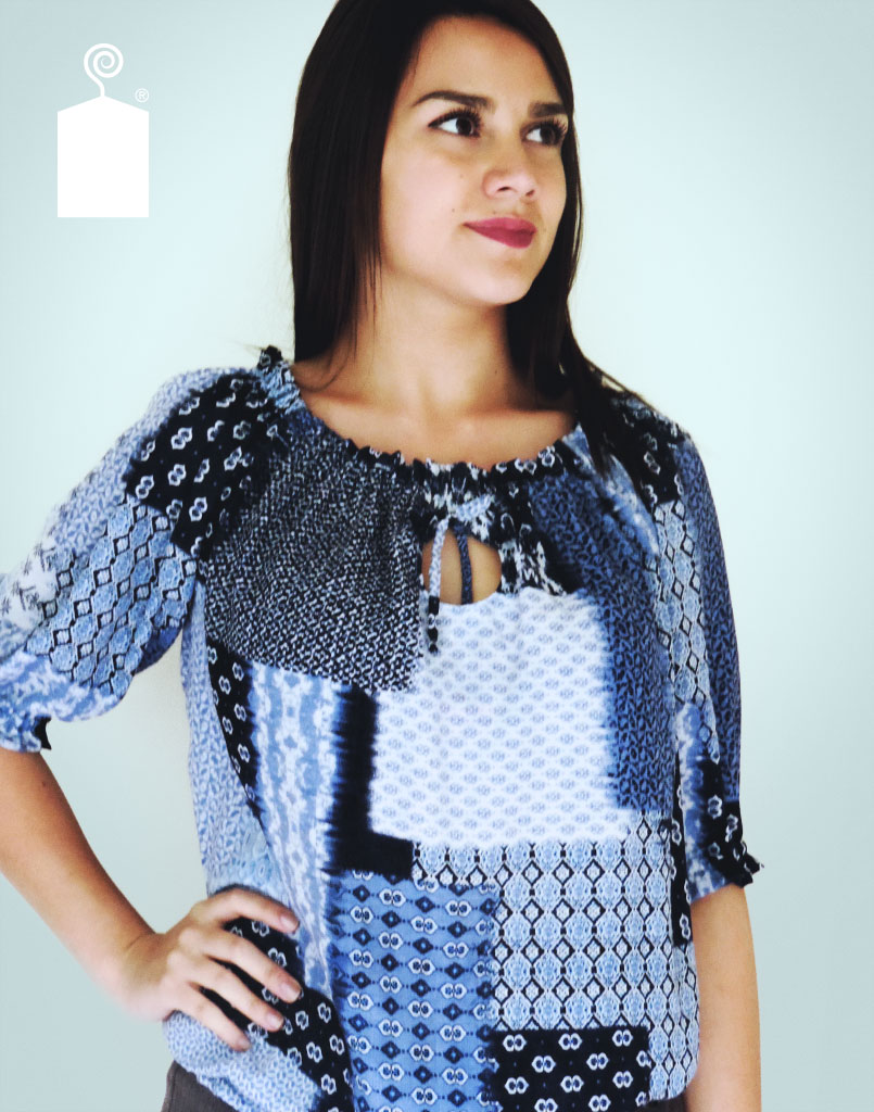 Blusa con cuello y mangas 3/4 en elástico. Lazo y apertura al frente