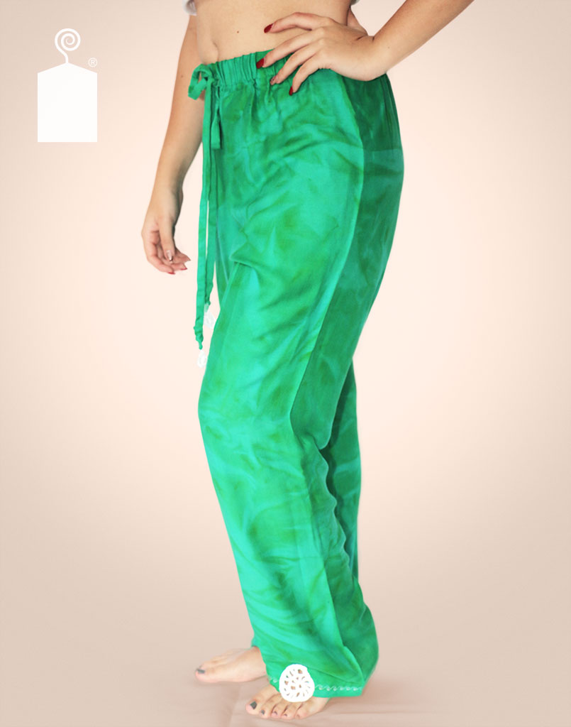 Pantalón estampado, con elástico y cordón de ajuste en la cintura con aplicaciones de ganchillo.